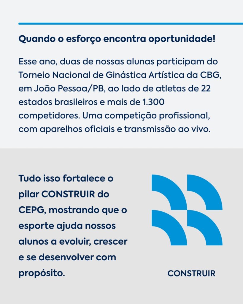 Duas de nossas alunas estão vivendo uma experiência incrível no Torneio Nacional de Ginástica Artística, em João Pessoa – PB. 💙💚 Representando muito bem o CEPG, elas competem entre atletas de todo o país, mostrando dedicação, força e amor pelo esporte. Temos orgulho em apoiar essa jornada e contribuir para que cada passo delas seja uma construção de aprendizado, confiança e crescimento.